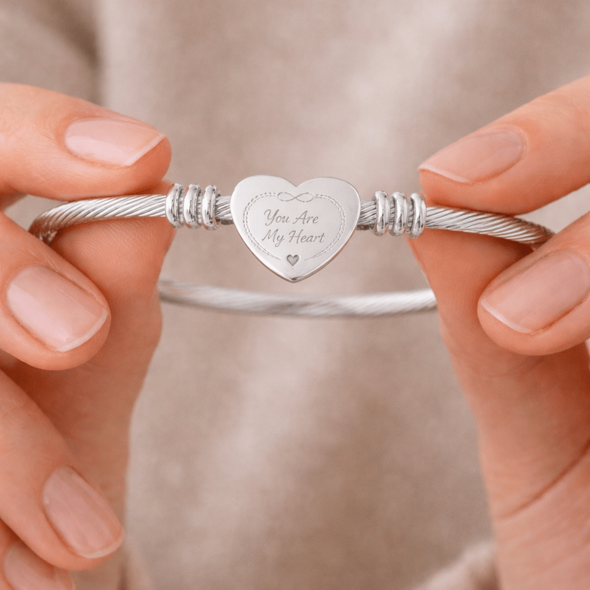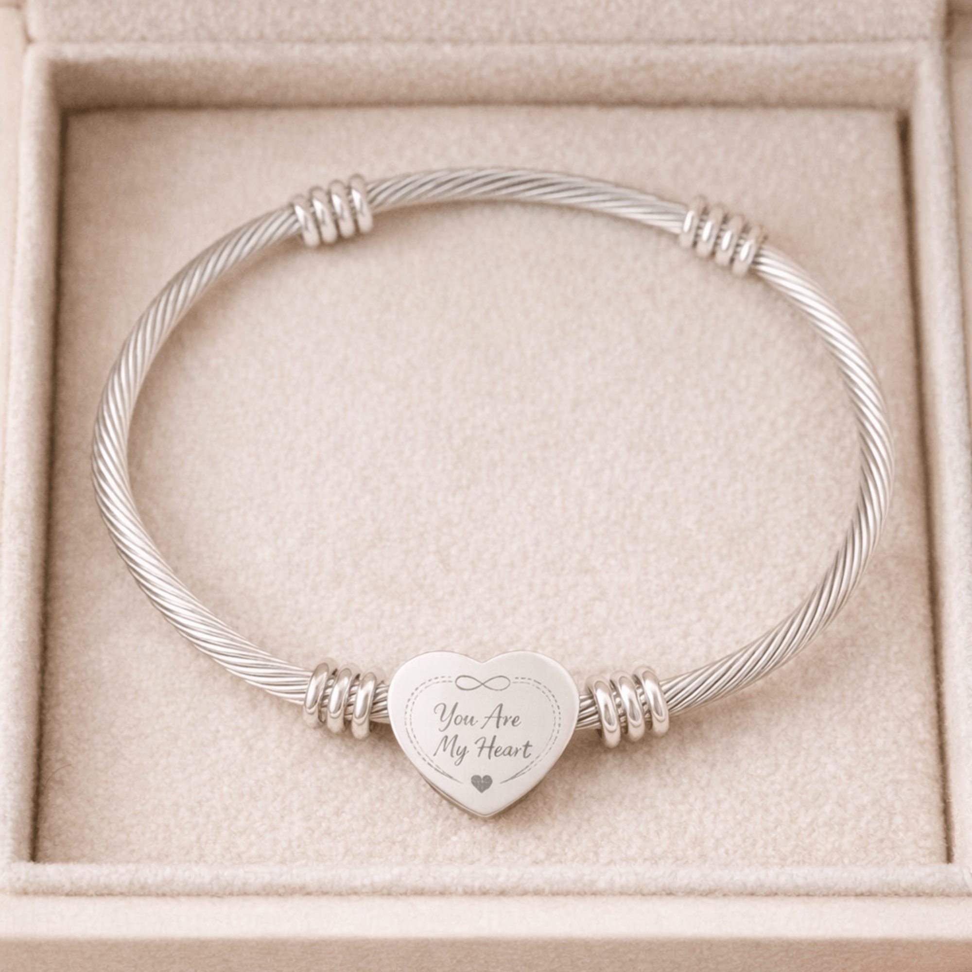 A slim, understated cuff that reads like a quiet promise on the wrist. The twisted stainless cable hugs the arm with a delicate tension, while a small engraved heart charm catches the light without calling attention. It feels steady during a dusk walk, gentle at a low-key dinner with friends, and reassuring through everyday routines. Lightweight and low-profile, it layers naturally with other bracelets or stands alone as a private talisman. The surgical-grade 316L steel and PVD finish keep the piece bright through regular wear, and the hypoallergenic construction lets sensitive skin wear it all day without fuss. Each bracelet arrives tucked into a white gloss jewelry box on non-tarnish cotton, ready to be handed over in a quiet, meaningful moment.
