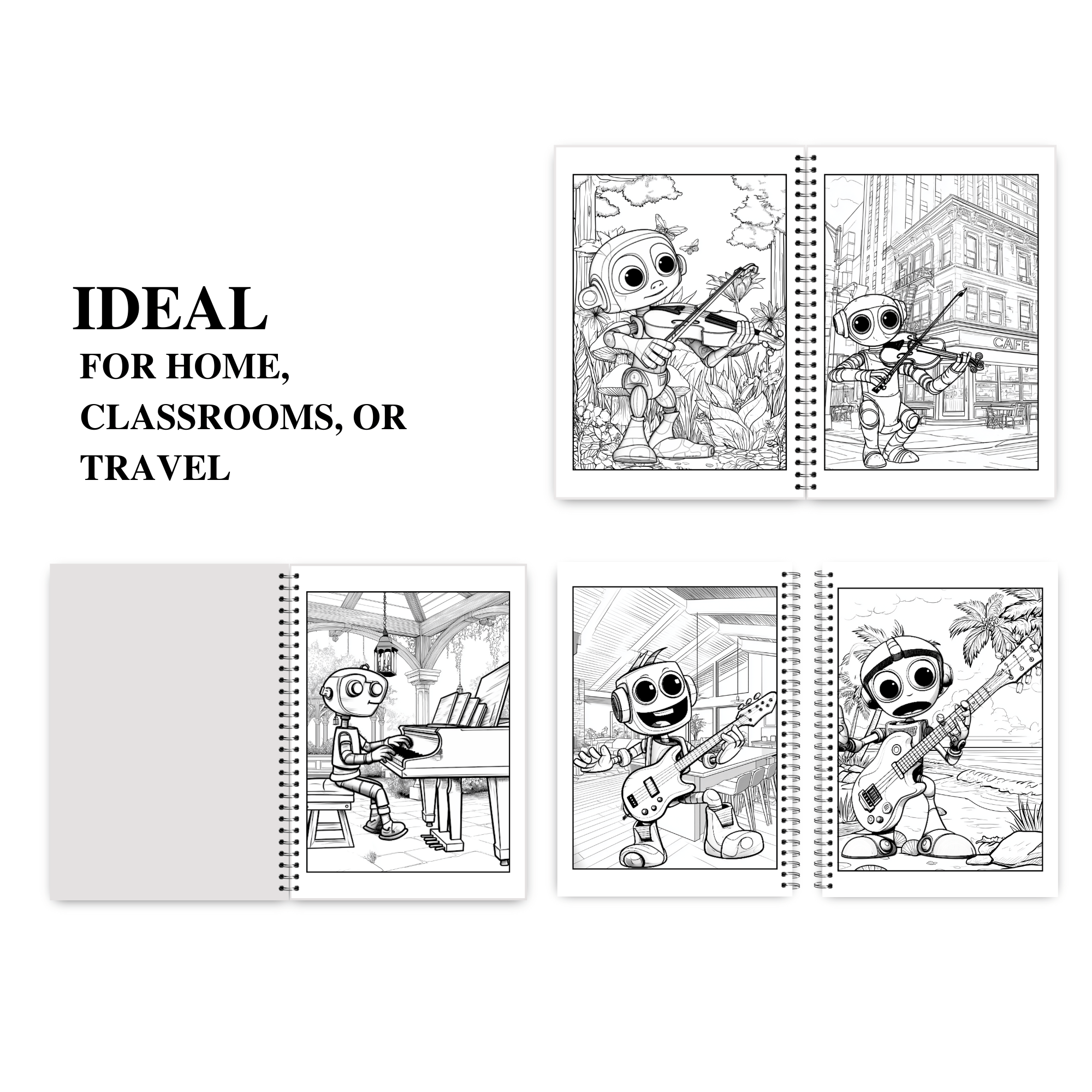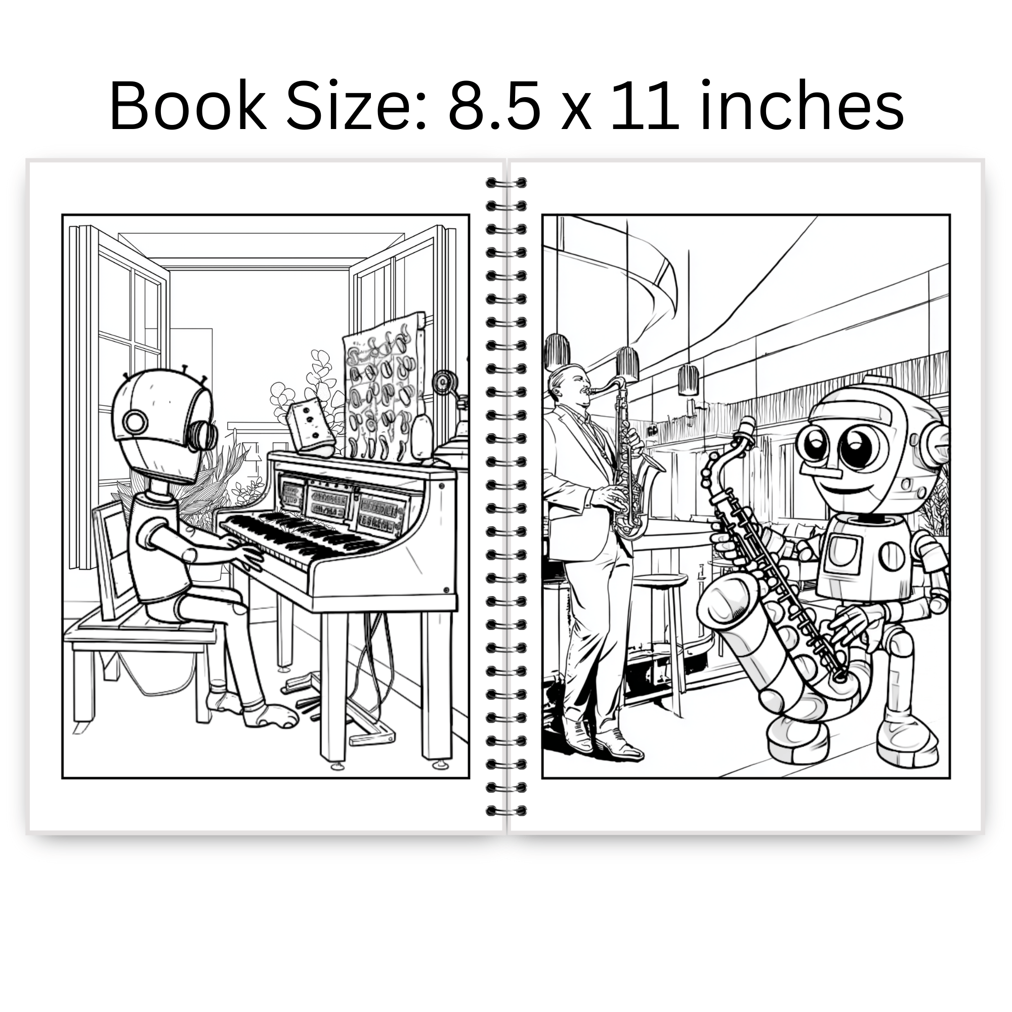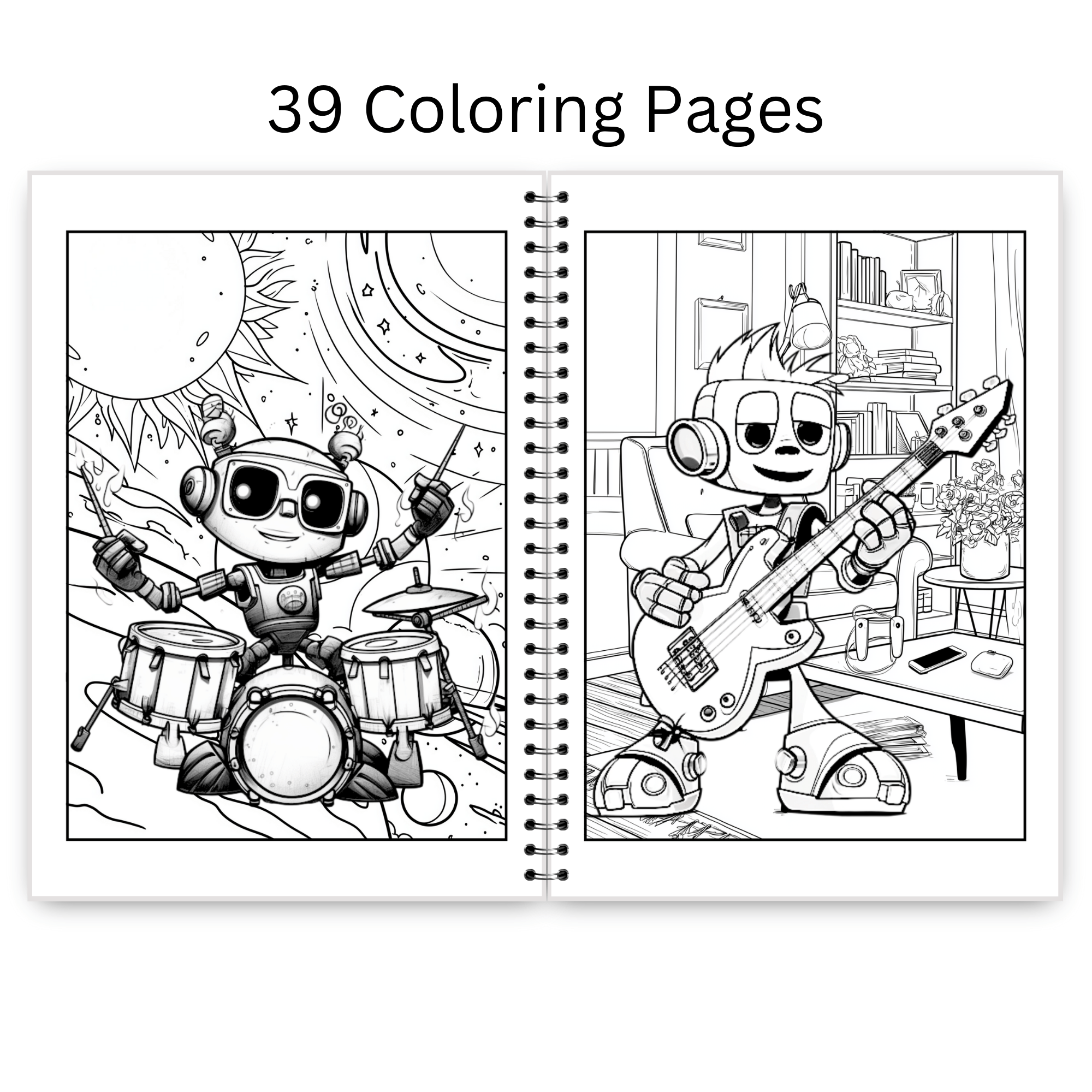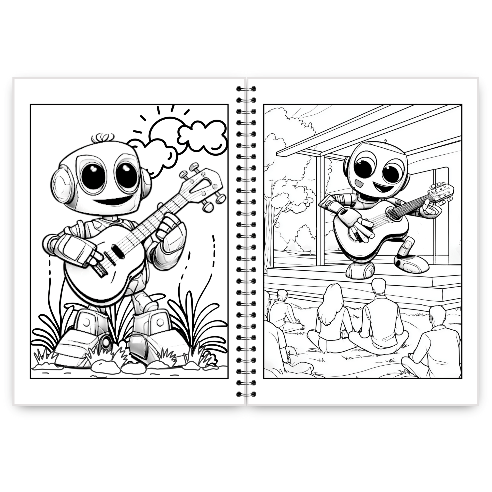 Unleash your creativity with the Robot Musicians Coloring Book, a unique blend of futuristic technology and musical artistry. This adult coloring book and kids coloring book features 40 detailed coloring pages filled with imaginative sci-fi robot characters playing instruments, rocking out on stage, and creating cosmic symphonies.